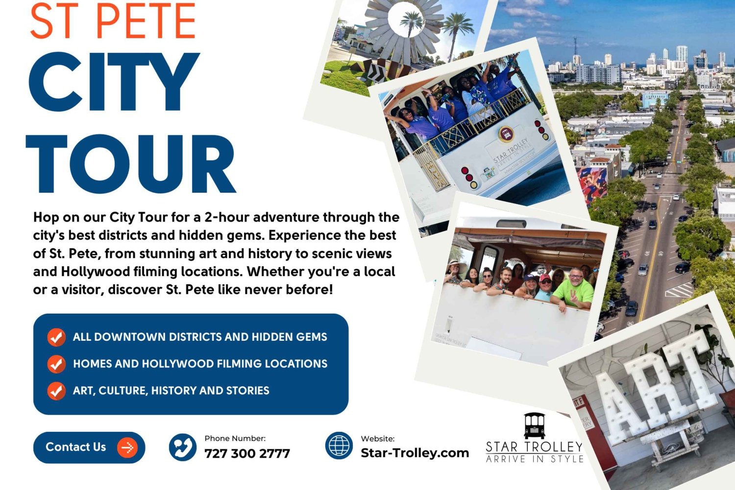 Führung durch die berühmtesten Sehenswürdigkeiten, Kunstviertel und versteckten Schätze von St. Pete Visuelle Highlights mit hochauflösenden Monitoren, die faszinierende Geschichten und historische Einblicke bieten Bequeme Sitze mit weichen Kissen und kostenlosem Wasser, damit du dich erfrischen kannst Exklusiver Stopp in der St. Petersburg Distillery: Besichtige das Gelände, lerne die Kunst der handwerklichen Destillation kennen und entdecke die spannenden Zukunftspläne der Brennerei als Teil der Harmony Grove-Entwicklung Flexibles Erlebnis: Geschlossene Trolleys für Komfort und Schutz vor Wind und Wetter, wenn nötig Tolle Fotomotive: Genieße jede Menge Instagram-würdige Momente mit Wandmalereien, Blick auf das Wasser und kulturellen Hotspots Haltestellen an wichtigen Orten: Sieh das Beste von St. Pete, von historischen Stätten bis zum künstlerischen Herzen der StadtEasy cancellation